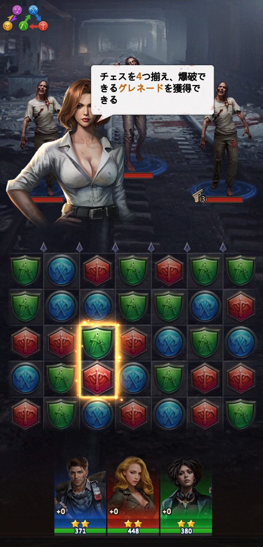 1つのパズルを動かして同じ色のパズルを3つ揃えると消えることになっており、消したパズルの前にいるゾンビへダメージを与えられます。