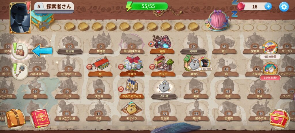 ゲームはマップから調査したいスポットを選ぶところから始まり、画面の中に隠されている指定アイテムを見つけ出していきます。