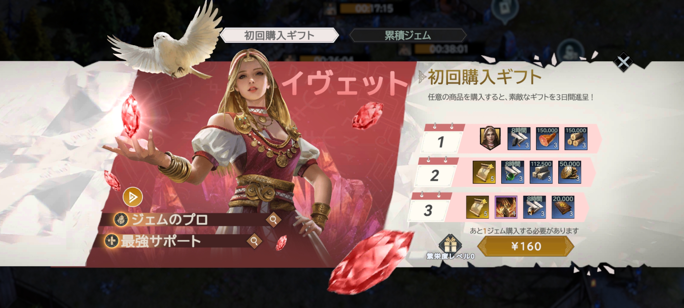 これはジェムを160円分購入しても貰えるギフトで、3日間に分けてアイテムを手に入れることができます。
