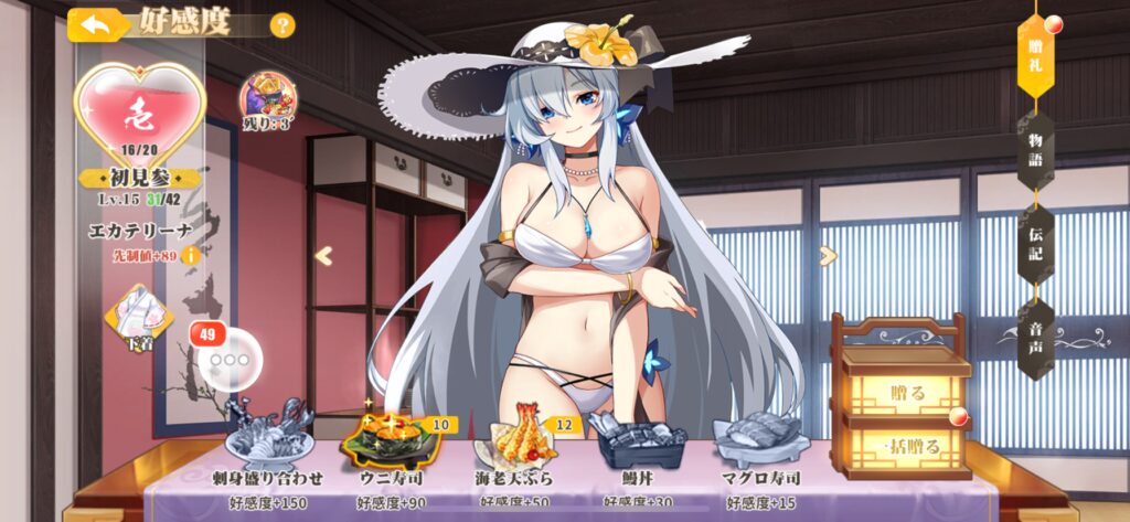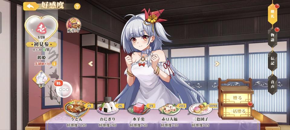 お城コンテンツ内にある「百花園」では、少女たちに食べ物などの貢ぎ物を贈ることで好感度を上げられます。